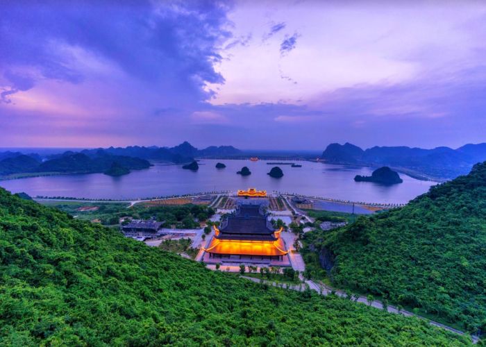Chùa Tam Chúc ở huyện Kim Bảng, Hà Nam, là quần thể chùa lớn nhất thế giới với diện tích 5.100 ha. Ảnh: nhimsoc13Chùa sở hữu nhiều công trình đồ sộ như Điện Tam Thế, nơi đặt ba pho tượng Phật bằng đồng nặng 200 tấn, Điện Pháp Chủ với tượng Phật Thích Ca nặng 150 tấn, và Chùa Ngọc, xây hoàn toàn từ 3.000 tấn đá granite đỏ, không dùng xi măng. Ngoài ra, du khách có thể tham quan Vườn Cột Kinh, đi thuyền trên hồ Tam Chúc và tham gia lễ hội rằm tháng Giêng.