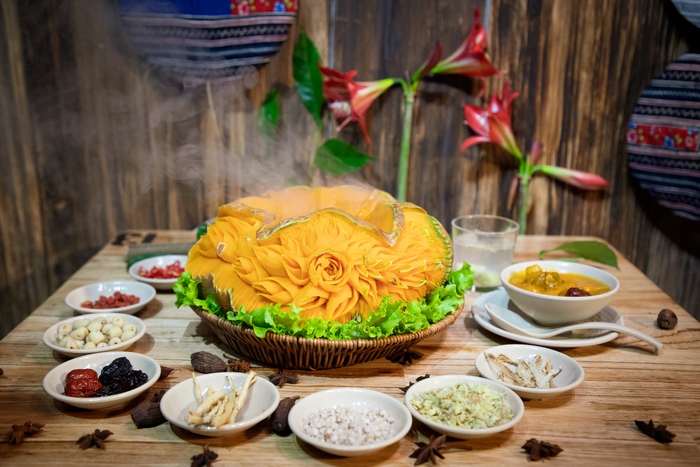 Gà đen ủ bí ngô: Món ăn cầu kỳ trong từng công đoạn chế biến, kết hợp giữa vị ngọt thanh tự nhiên của thịt gà cùng nước sốt sánh mịn, đậm đà từ bí ngô.
