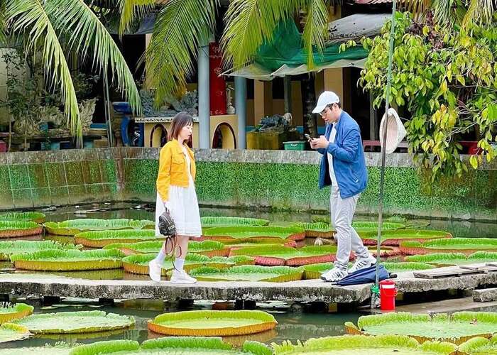 Trải nghiệm đứng trên lá sen sẽ mất phí khoảng 20.000 VND. Ảnh: khaa.aii- Buổi sáng tầm 9h là thời điểm đẹp nhất để bạn ghé thăm và chụp ảnh sống ảo với ao sen. Tuy nhiên, thời điểm này khách tham quan rất đông nên bạn sẽ phải chờ đợi một chút để check-in cùng ao sen.