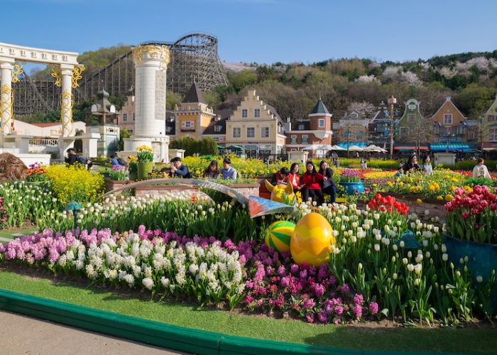 Công viên Everland Hàn Quốc không chỉ hấp dẫn với những trò chơi sôi động mà còn nổi bật với những khu vườn hoa rực rỡ, thay đổi theo từng mùa, mang đến khung cảnh tuyệt đẹp suốt cả năm.