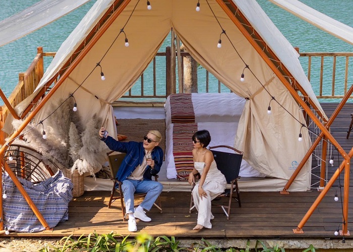 Dựng lều và tận hưởng vẻ đẹp đất trời không khói bụi. Ảnh: thanhmaicomTrên hồ Ba Khan - địa điểm dã ngoại ở Hòa Bình Phú Thọ, bạn không thể bỏ qua hoạt động chèo thuyền, câu cá rồi. Sau khi dựng lều xong, du khách hãy tranh thủ tham gia vận động ngoài trời trước khi hoàng hôn buông xuống nhé.