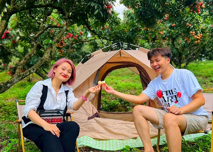 Bạn có thể thăm quan, cắm trại, hoà mình vào thiên nhiên tại các điểm check in mùa vải Bắc Giang. Ảnh: Báo Bắc GiangThị xã Chũ có tới 5 vùng sản xuất vải thiều theo tiêu chuẩn GlobalGAP. Với kinh nghiệm và việc tuân thủ quy trình sản xuất nghiêm ngặt cùng điều kiện thời tiết thuận lợi mà các vườn vải ở đây đều phát triển tốt, cùi dày, ăn ngọt.