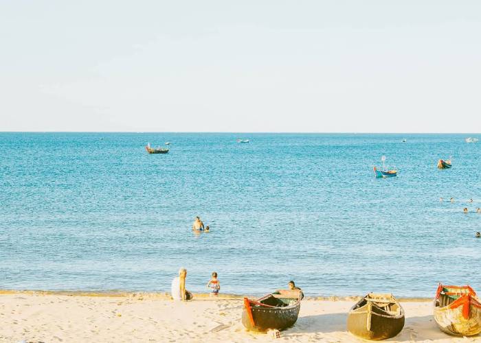 Bãi biển hoang sơ với cát trắng mịn và nước biển trong xanh là nơi lý tưởng để tắm biển và thư giãn. Vào buổi sáng, khi thủy triều rút, bãi biển trở nên rộng lớn, thích hợp cho các hoạt động như cắm trại, picnic hay team building. Nhiều dịch vụ cho thuê lều bạt đã xuất hiện tại đây, giúp bạn dễ dàng tổ chức một buổi cắm trại ngay bên bờ biển.