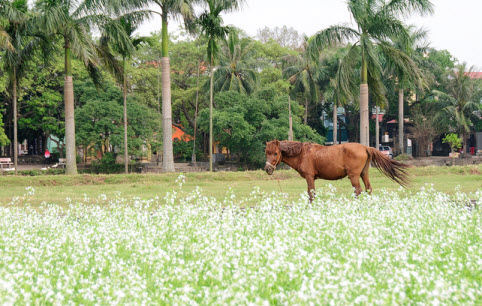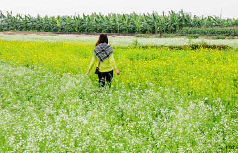 Hoa cải vàng, trắng nở rất nhiều tại cánh đồng Lệ Chi. Bạn có thể đi theo lối vào chùa Sen Hồ hoặc từ đường đê đến đình thôn Chi Đông thì rẽ phải xuống.