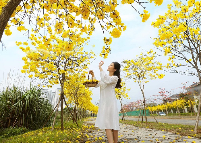 Chỉ cần lang thang Hà Nội bạn đã có thể thấy sắc vàng của hoa phong linh. Ảnh: Phạm Hồng VânTại con đường thuộc khu đô thị ParkCity Hanoi (quận Hà Đông), hàng trăm cây phong linh được trồng thẳng tắp tạo cảnh quan đẹp hiếm có. Cứ bước vào Hà Nội mùa hoa tháng 3, phong linh ở đây lại tràn ngập sắc vàng, khoác áo mới cho một góc Thủ đô. Nhiều người tới đây đi dạo bộ, chụp ảnh sống ảo... Đoạn đường còn có bậc thang để bạn dễ dàng ngắm hoa, check in với hoa ở khoảng cách lý tưởng.