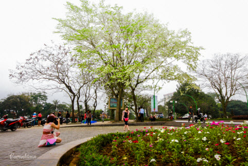 Một trong những cây hoa sưa nổi tiếng thu hút rất đông các bạn trẻ tới chụp hình nằm ở đường Thanh Niên, trước một khoảng sân rộng nhìn ra Hồ Tây.
