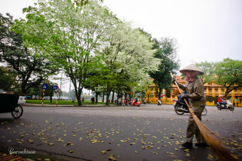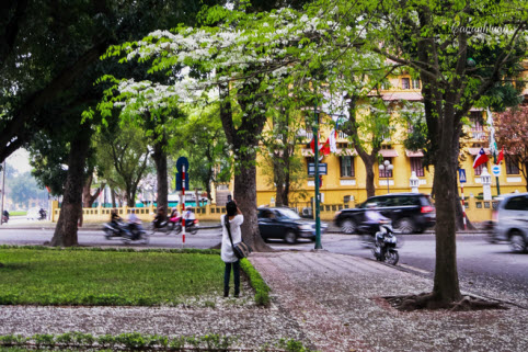 Khi hoa sưa nở rộ là lúc tiết trời ấm dần lên. Bởi thế vào những ngày trời trong, nắng nhẹ, dạo chơi trên các con phố ở Hà Nội, du khách sẽ có dịp ngắm nhìn những thân cây cao vút chỉ phủ một màu trắng xóa của hoa sưa.