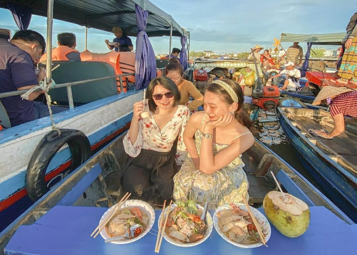 Đừng bỏ lỡ trải nghiệm thưởng thức các món ăn sáng nóng hổi khi đang lênh đênh trên sông bạn nhé. Ảnh: nhinhi.daibandoanhThời điểm ghé thăm chợ nổi Cái Răng lý tưởng nhất là từ 4h – 5h sáng, lúc này các ghe xuồng đã bắt đầu đua nhau cập chợ nên bạn sẽ có cơ hội chiêm ngưỡng bức tranh thường nhật của người dân xứ Tây Đô và “bắt trọn” được khoảnh khắc bình minh trên sông thơ mộng.