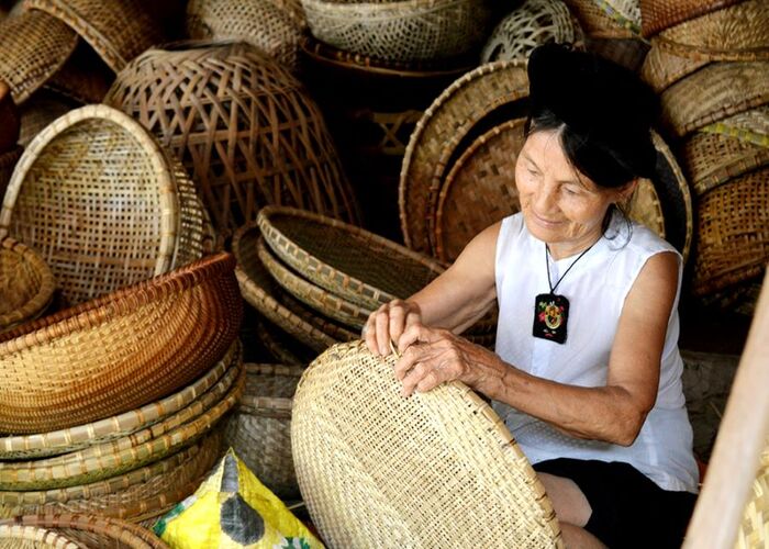 Hiện nay làng nghề đã được đầu tư để duy trì sản xuất tạo ra các sản phẩm chất lượng phục vụ cho nhu cầu mua quà lưu niệm của du khách. Ảnh: MIA.vnCác sản phẩm tại làng nghề vô cùng đa dạng và phong phú như: thúng, xà ngom, rổ, xà neng, bội nhốt gà, cần xé nhỏ và nhiều mặt hàng thủ công mỹ nghệ khác đòi hỏi sự khéo léo, tỉ mỉ như chiếc ghe, khay đựng trầu…được làm bằng nguyên liệu chủ yếu là tre, trúc.