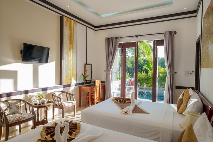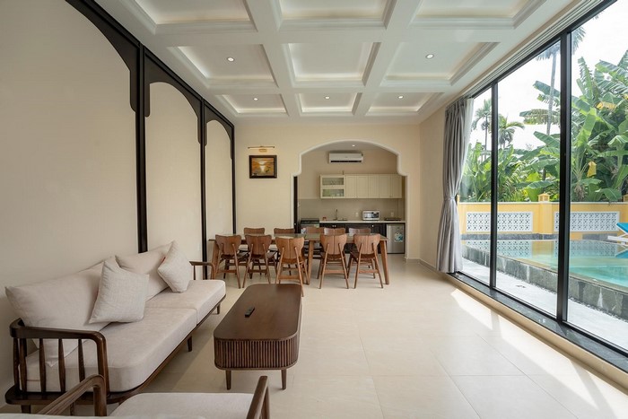 Thứ hai, tiện nghi tại Luna Villa Hoi An được thiết kế để đáp ứng mọi nhu cầu của du khách hiện đại. Mỗi biệt thự đều có hồ bơi riêng – một điểm nhấn sang trọng, mang đến cảm giác riêng tư và thư giãn tuyệt đối. Phòng ngủ rộng rãi với nội thất tinh tế, phòng khách ấm cúng, và bếp riêng đầy đủ dụng cụ cho phép du khách tự do nấu nướng như ở nhà. Sân vườn xanh mát, không gian ngắm hoàng hôn bên hồ, và những tiện ích như xe đạp miễn phí hay dịch vụ đưa đón càng làm tăng giá trị trải nghiệm. Tất cả được chăm chút để mang lại sự thoải mái tối đa, biến kỳ nghỉ thành một hành trình tận hưởng thực sự.