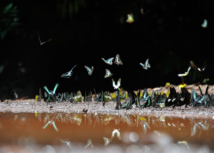 Khám phá mùa bướm rừng Mã Đà thu hút nhiều bạn trẻ và các gia đình có con nhỏ gần Đồng Nai. Ảnh: Hiforest Tùy theo thời tiết từng năm mà bướm có thể xuất hiện sớm hơn, từ tháng 4. Theo kinh nghiệm săn bướm rừng Mã Đà, chúng sẽ thường tụ lại bên những khu đất còn đọng nước sau cơn mưa, đặc biệt là những khu vực có nước chảy qua. Tại rừng Mã Đà, không chỉ một loài mà cực nhiều loài bướm tìm đến để hút khoáng chất dưới nền đất đỏ. Bướm tụ tập lại với nhau từng khóm một, trông như chốn thần tiên vậy.