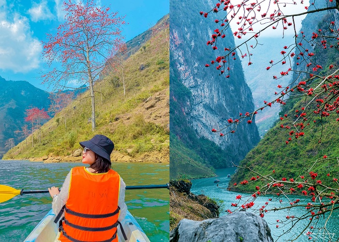 Sông Nho Quế trong mùa hoa gạo càng thêm lãng mạn và phiêu du. Bạn có thể đón thuyền đi trải nghiệm cảm giác thong dong trên sông và sẽ thấy hoa gạo trên sông Nho Quế đẹp khác lạ so với những nơi khác. Điểm xuyến trên những triền núi xanh, cao vời vời, hoa gạo khiến ai nấy cũng phải đưa điện thoại hay máy ảnh ra để lưu lại khoảnh khắc tuyệt đẹp.