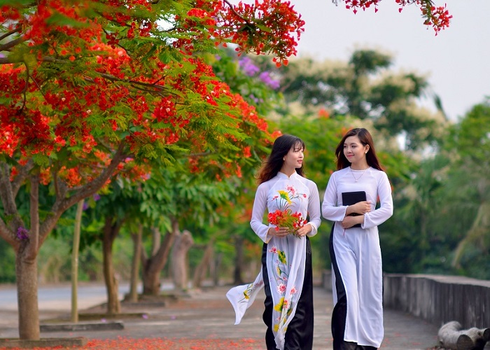 Hình ảnh hoa phượng gắn liền với tuổi học trò, gợi lên bao ký ức trong mỗi người. Ảnh: loveaodaiNgười dân Hải Phòng thường gọi cây phượng là cây ba giăng (“giăng” là “trăng”). Ba giăng nghĩa là 3 mùa trăng, ý chỉ 3 tháng vì chúng nở trong 3 tháng hè. Cũng chính do thời gian nở này mà hoa phượng còn được xem như loài hoa của tuổi học trò.