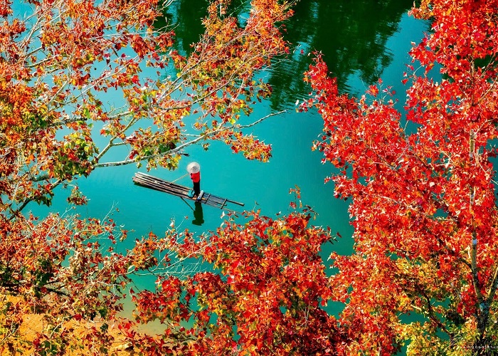 Bạn có thể chèo thuyền thong dong ngắm cảnh mùa lá đỏ hồ Bản Viết Cao Bằng. Ảnh: TripdiVào mùa lá đỏ hồ Bản Viết Cao Bằng, ngoài việc đi dạo quanh hồ ngắm cảnh, khách du lịch còn có thể ngồi trên bè mảng ngao du trên mặt hồ. Trải nghiệm này cực phù hợp với những vị khách nào thích du ngoạn theo phong cách mới và thích cảm giác phiêu lưu. Thuyền chầm chậm trôi mặt hồ, len lỏi qua cánh rừng rậm, tiếng chim hót chuyền cành… cảm giác thật bình yên và thư thái.