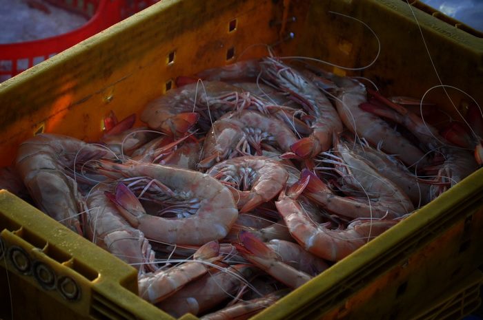 Những thùng tôm bạc còn bốc hơi lạnh từ đá ướp được khiêng lên, phản chiếu sắc hồng trong ánh sáng đầu ngày.