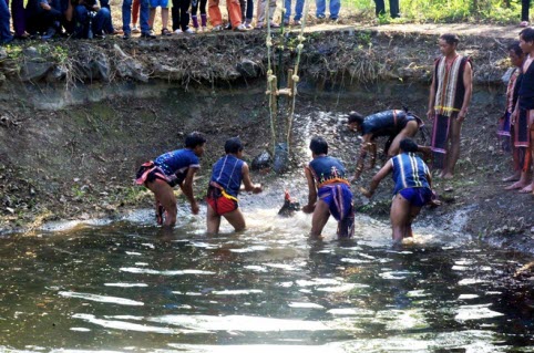 Trong khi già làng khấn thông báo và cầu mong thần linh cho hạt mưa to, mọi người tập trung tát nước vào con gà và người thanh niên được chọn.