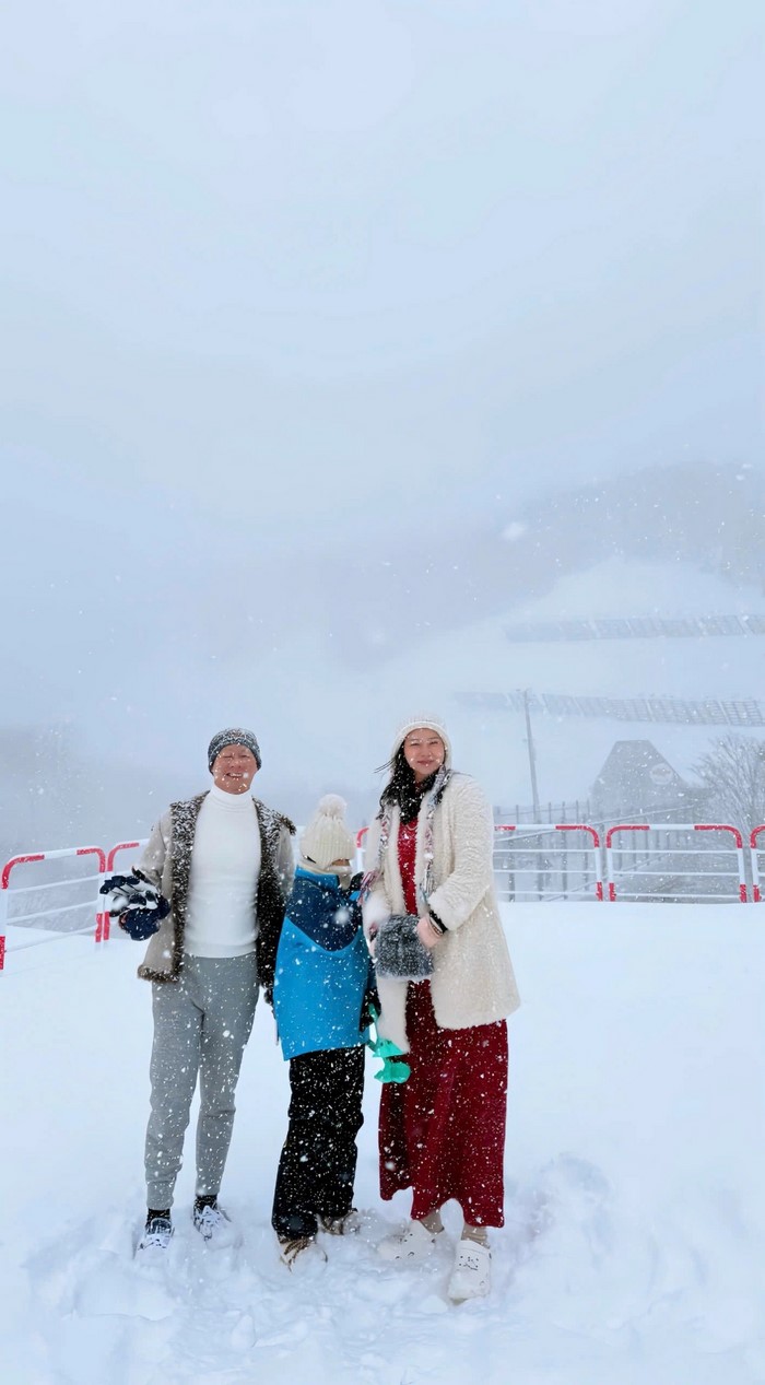 Cô cũng hào hứng chia sẻ: “Kỷ niệm lần đầu tiên trong đời Bồ Câu nhìn thấy tuyết” với bức hình cả nhà chụp giữa bão tuyết tại khu nghỉ dưỡng trượt tuyết cách trung tâm khoảng 100 km".