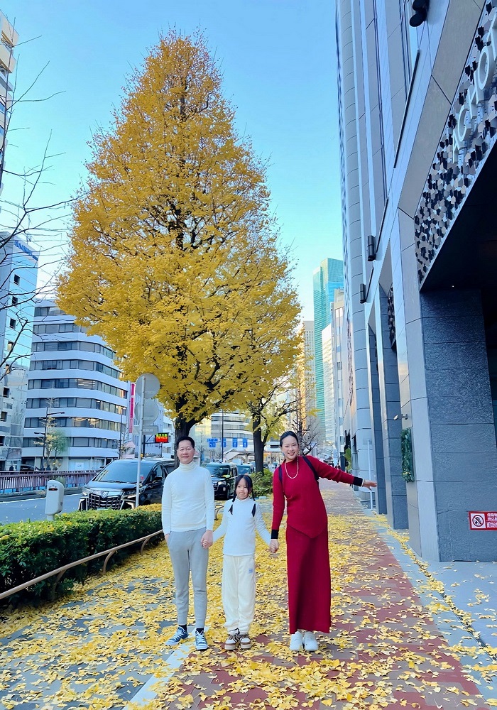 Gia đình Phan Như Thảo check - in cảnh lá vàng rơi tại Tokyo. Ảnh: VNExpress.Trong những bức ảnh được chia sẻ, bé Bồ Câu cũng tỏ ra rất hào hứng trong chuyến nghỉ dưỡng cùng bố mẹ.