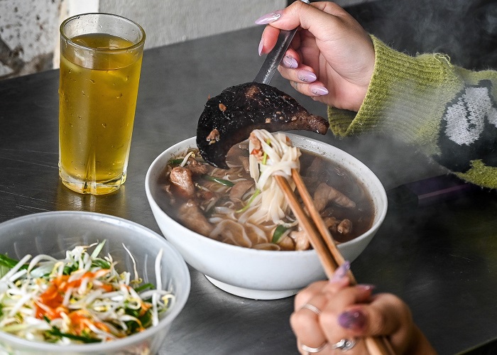 Phở gan cháy với phần topping độc đáo, đầy ú ụ xứng đáng là quán ăn ngon ở Bắc Ninh. Ảnh: FoodieNước dùng món phở này cũng được ninh từ xương ống trong vòng nhiều giờ. Khi có khách gọi đồ, chủ quán sẽ đưa nước dùng đun qua chảo vừa xào với thịt giúp phần nước thêm béo ngậy hơn. Thực khách có thể ăn kèm hành chẻ, giá đỗ, rau húng để chung hòa hương vị. Giá mỗi bát phở tại địa chỉ ăn ngon Bắc Ninh này từ 30.000 - 50.000 đồng.