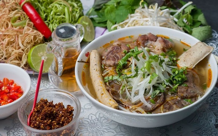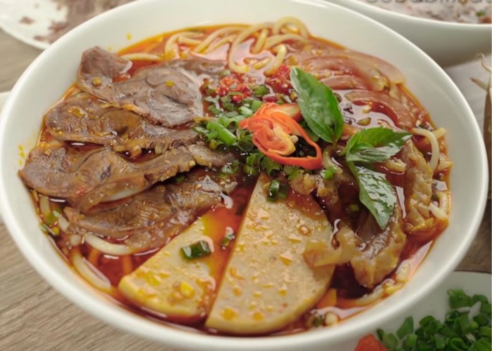 Điểm đặc biệt của bún bò Huế nằm ở nước dùng, được ninh từ xương bò trong nhiều giờ, thêm sả, mắm ruốc và ớt tạo nên hương vị thanh ngọt, cay nồng đặc trưng. Ngoài thịt bò thái lát mỏng, món ăn này còn đi kèm với chả cua, giò heo, tiết luộc và các loại rau sống tươi ngon như giá đỗ, rau thơm, bắp chuối bào sợi. Tô bún bò Huế khi được chan thêm chút ớt sa tế đỏ rực không chỉ kích thích vị giác mà còn làm say lòng thực khách nhờ màu sắc bắt mắt.