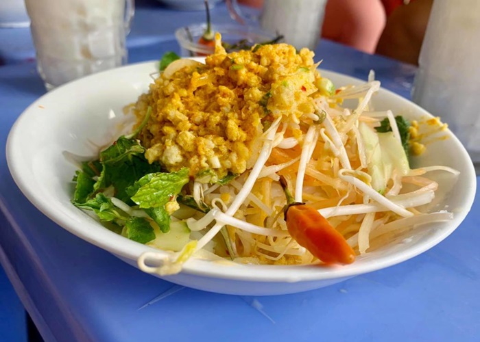 Bún kèn Phú Quốc, hương vị đậm đà hòa quyện cùng rau sống tươi ngon tạo nên món ăn khó quên. Ảnh: ivivuĐiểm nổi bật của các quán bún kèn ở Phú Quốc nằm ở nước lèo – một sự kết hợp hài hòa giữa nước cốt dừa, cá xay nhuyễn (thường là cá nhồng hoặc cá ngân), và các gia vị như sả, nghệ, và ớt. Tất cả tạo nên một hỗn hợp nước lèo sánh mịn, đậm đà và có màu vàng hấp dẫn. Khi ăn, bún kèn được ăn kèm với bún tươi, rau sống như giá đỗ, rau thơm và đặc biệt là đu đủ bào sợi. Những sợi đu đủ giòn ngọt hòa quyện cùng nước lèo béo ngậy, tạo nên một hương vị độc đáo, vừa thanh mát vừa đậm đà, khó lòng quên được.