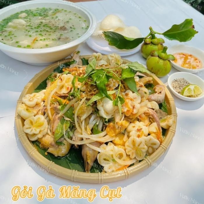 Vườn Măng Bình Nhâm là một trong những quán gỏi gà măng cụt ngon ở Bình Dương HCM được giới sành ăn nhắc đến như điểm hẹn ẩm thực đậm chất miệt vườn. Quán thu hút đông đảo du khách cuối tuần nhờ không gian thoáng đãng, mang phong vị thôn quê giản dị nhưng tinh tế. Món gỏi gà măng cụt tại đây được chế biến từ gà ta thả vườn – thịt săn chắc, ngọt tự nhiên – kết hợp cùng măng cụt Lái Thiêu vừa độ, mang đến vị chua thanh nhẹ và giòn sần sật đặc trưng.