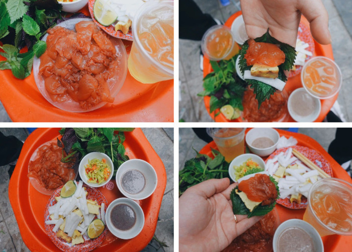 Quán sứa đỏ Bạch Mai mở cửa từ 7 giờ sáng đến 1 giờ chiều luôn tấp nập khách đến thưởng thức. Ảnh: GostayCách ăn sứa đỏ tại quán ở phố Bạch Mai cũng tương tự như những nơi khác. Bạn ăn sứa kèm với một miếng đậu phụ nướng vàng, thêm vài lát cùi dừa rồi cuốn gọn tất cả trong lá tía tô và chấm cùng mắm tôm.
