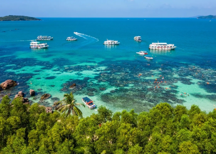 Trong cẩm nang du lịch Phú Quốc, các điểm đến không được chọn ngẫu nhiên mà được sắp xếp theo một mạch trải nghiệm liền mạch, giúp du khách vừa khám phá, vừa nghỉ ngơi mà không bị mệt. Hành trình thường bắt đầu từ khu vực cảng An Thới, di chuyển bằng cano cao tốc ra đảo đầu tiên – nơi tạo ấn tượng ban đầu mạnh nhất về cảnh quan biển đảo.