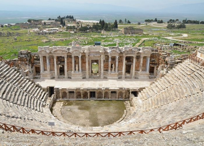 Ngày nay, khi ghé thăm, bạn vẫn có thể chiêm ngưỡng những hàng ghế đá xếp tầng uốn lượn, sân khấu được chạm khắc tinh xảo với các bức phù điêu mô tả thần thoại Hy Lạp, và các chi tiết kiến trúc độc đáo. Từ những hàng ghế trên cao, nhà hát còn mang đến tầm nhìn toàn cảnh ngoạn mục ra toàn bộ khu di tích Hierapolis rộng lớn cùng những bậc thang đá vôi trắng muốt của Pamukkale phía xa.