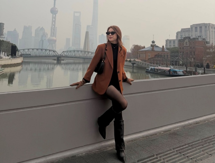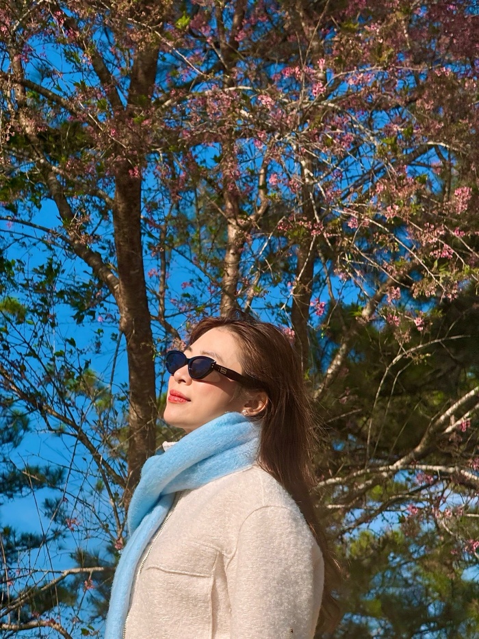 Trong chuyến đi ngắm hoa mai anh đào tại Lâm Đồng, cô nàng lựa chọn phong cách tối giản nhưng cực kỳ hiệu quả. Giữa sắc hồng nhẹ nhàng của hoa, cô khéo léo phối một chiếc áo khoác trắng kem thanh lịch kết hợp cùng khăn choàng len màu xanh pastel. Điểm nhấn là chiếc kính râm thời thượng, giúp tổng thể bộ trang phục vừa giữ được nét dịu dàng, vừa mang hơi hướng hiện đại, trẻ trung.