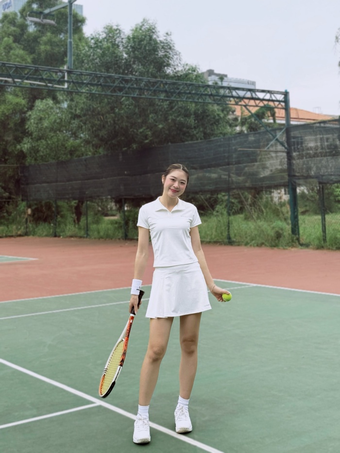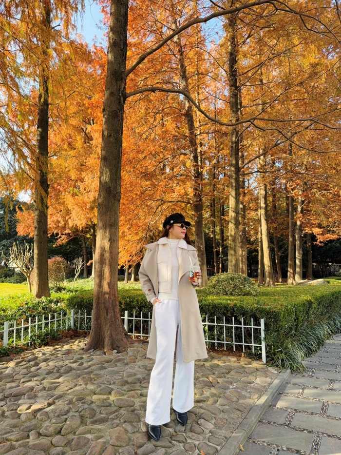 Đây là minh chứng rõ nét nhất cho thành quả của việc chăm sóc bản thân và giữ gìn vóc dáng. Gu thời trang của cô đề cao sự thoải mái nhưng vẫn phải đảm bảo tính thẩm mỹ cao. Cách cô chọn phụ kiện như kính mắt gọng vàng và kiểu tóc buộc thấp tinh tế cho thấy một tư duy thời trang ổn định, luôn biết cách làm mình nổi bật giữa không gian xanh mướt của thiên nhiên.