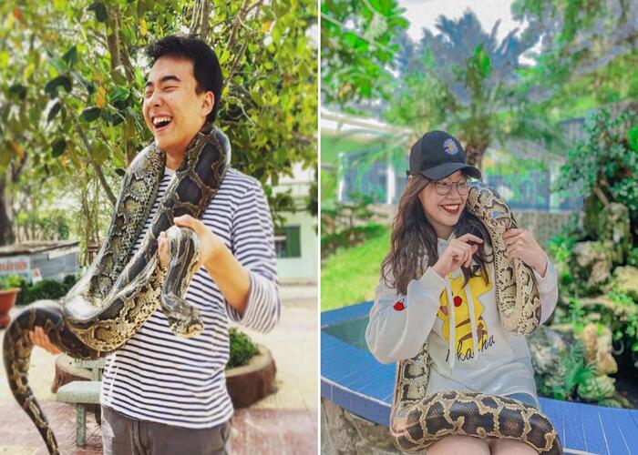 - Nếu bạn gan dạ và không ngại tiếp xúc với rắn thì nhớ trải nghiệm cho trăn “khủng” quấn quanh người.