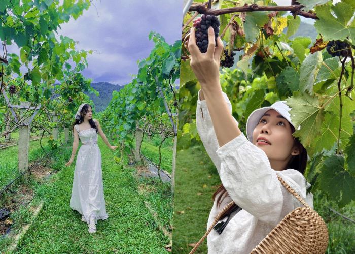 Check in tại vườn nho thung lũng Nam Yên, trải nghiệm đầu tiên mà du khách sẽ thích thú đó chính là cơ hội được check in trong vườn nho xanh mướt, trải dài dưới ánh nắng mặt trời. Bạn có thể dạng bước bên những hàng nho xanh mướt hoặc tạo dáng bên những chùm trĩu quả, bầu không khí ở đây vô cùng dễ chịu, kết hợp với sắc xanh của cây lá dưới ánh nắng mặt trời, càng khiến cho trải nghiệm thêm phần hoàn hảo. Với những tín đồ đam mê sống ảo thì chắc chắn cơ hội được thả dáng giữa một vườn nho đậm màu sắc đồng quê, ngắm những chùm trái cây lúc lỉu màu xanh, tím là bacgrouk hoàn hảo để ghi lại những bộ ảnh đẹp mang màu sắc vintage.