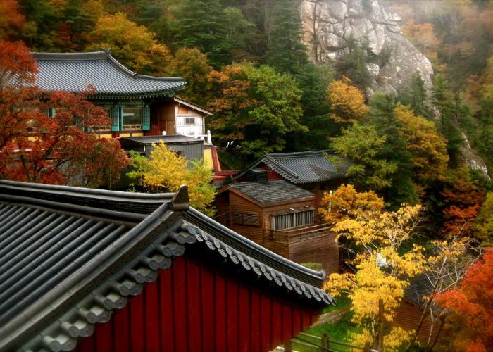 Đền Baekdamsa là một ngôi đền Phật giáo linh thiêng, nằm sâu trong khu vực Nội Seorak của vườn quốc gia Seoraksan. Ảnh: cupinklistiaKiến trúc của đền mang đậm phong cách truyền thống với các gian thờ trang nghiêm, tượng Phật cổ và những bức phù điêu tinh xảo. Đặc biệt, đền được bao quanh bởi khung cảnh thiên nhiên hùng vĩ, thay đổi tuyệt đẹp theo từng mùa. Vào mùa thu, nơi đây nổi bật với sắc đỏ vàng rực rỡ của rừng lá phong, tạo nên bầu không khí thanh tịnh, bình yên.