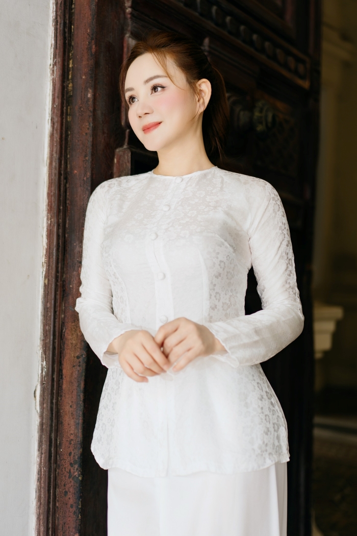 Rời xa những bộ cánh lộng lẫy, Vy Oanh trở về với hình ảnh "cô gái miền Tây" thanh thoát trong bộ áo bà ba trắng tinh khôi, khơi gợi nét đẹp chân phương và bình yên.