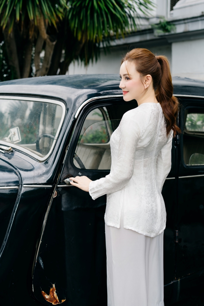 Với mái tóc buộc cao gọn gàng, Vy Oanh mang đến một cảm giác hoài niệm đầy chất thơ khi tạo dáng bên chiếc xe hơi cổ hay không gian kiến trúc xưa cũ.