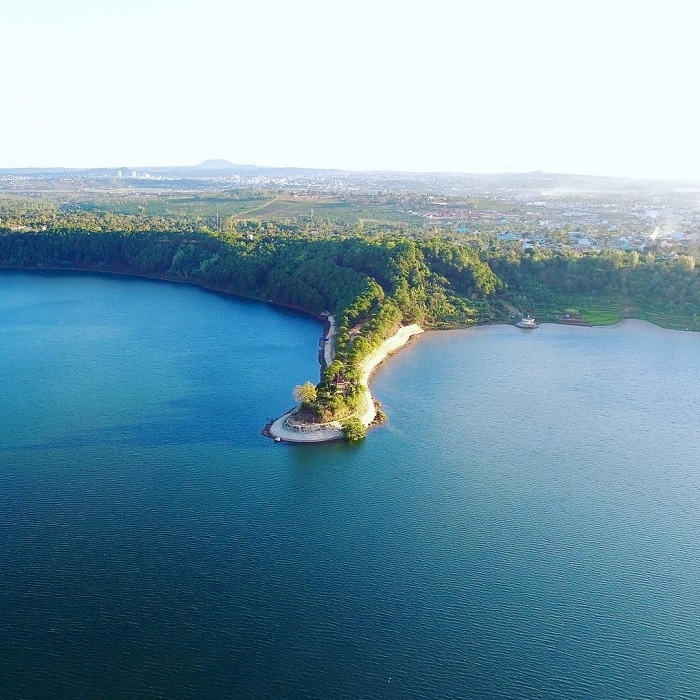 Toàn cảnh hồ T'Nưng khi nhìn từ trên cao. Ảnh: tinnhanhHồ T’Nưng có diện tích khoảng 230 ha, hình thành trên miệng của một ngọn núi lửa đã tắt từ hàng triệu năm trước. Với hình dạng tựa như một chiếc gương khổng lồ, mặt hồ phẳng lặng, xanh trong vắt, phản chiếu bầu trời và những ngọn núi xung quanh. Cảnh vật tại Hồ T’Nưng luôn thay đổi theo từng mùa, nhưng mùa nào cũng mang một vẻ đẹp riêng biệt, từ màu xanh biếc vào mùa hè đến vẻ huyền bí vào mùa sương mù. Vào sáng sớm, khi những tia nắng đầu tiên chiếu rọi, mặt hồ lung linh như một tấm gương, phản chiếu ánh sáng vàng rực rỡ và các đám mây bồng bềnh, tạo nên khung cảnh vừa lãng mạn lại vừa kỳ vĩ.