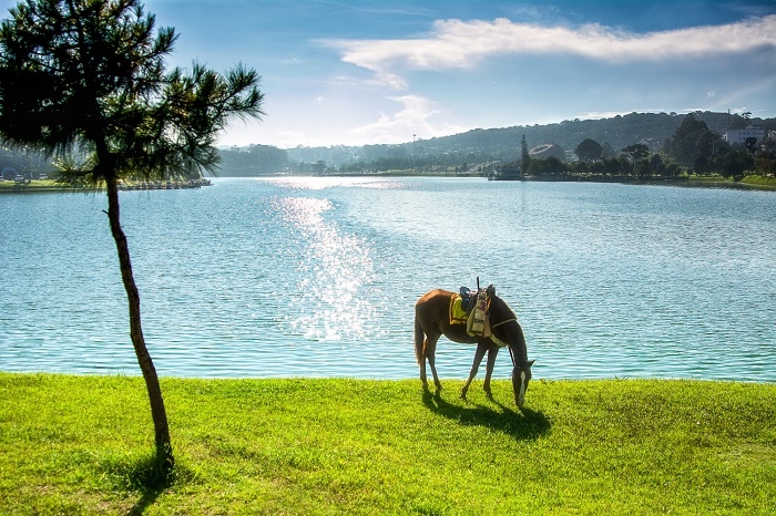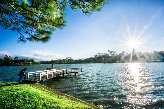 Hồ Xuân Hương còn được ví von với một chiếc gương khổng lồ nằm nép mình bên hàng thông êm đềm đểm. Ảnh: dulichvietvuiNước hồ Xuân Hương trong xanh như ngọc, soi rõ từng hàng cây nhành cỏ hai bên bờ. Vào mùa mưa, nước hồ chuyển sang màu đỏ của phù sa bồi đắp, nhưng không vì thế mà hồ nước này mất đi nét đẹp nên thơ hiếm có.