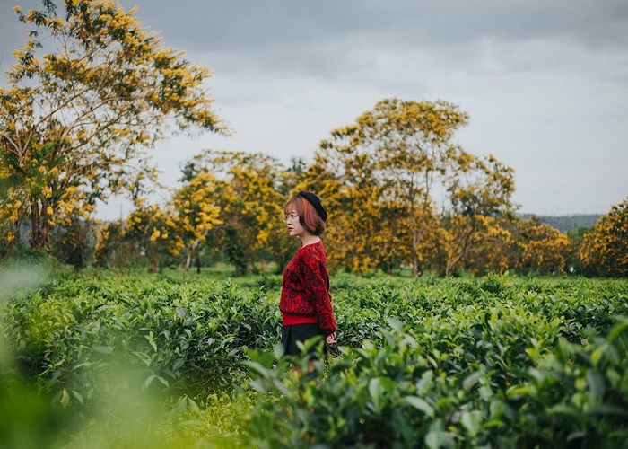 Những con đường cắt ngang nương chè Pleiku là sự hiện diện của loài hoa dã quỳ - sắc hoa vàng đặc trưng nơi phố núi. Tuy không quá nhiều như Đà Lạt ngàn hoa, nhưng tháng 11 về cũng là lúc những cánh đồng chè được điểm tô thêm sắc vàng rực rỡ. Đó là lý do mà đồi chè ở Gia Lai này trở thành điểm đến được nhiều bạn trẻ rỉ tai nhau. Bởi ai cũng muốn được một lần vẫy vùng thỏa thích, chụp ảnh mê say trong một không gian ngập sắc vàng, sắc xanh của cỏ cây hoa lá.