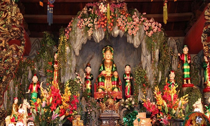 Ban thờ Mẫu hay còn gọi là Tam tòa Thánh Mẫu vơi tượng Mẫu Liễu Hạnh được đặt ở chính giữa. Ảnh: kosmohotayview