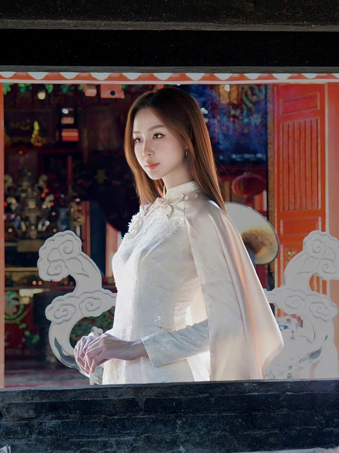 Loạt ảnh xinh đẹp được cô nàng đăng tải vào dịp mùng 1 Tết. Ảnh: FBNV.Không chọn phong cách cầu kỳ hay rực rỡ, nàng hậu xuất hiện với thiết kế tối giản, chất liệu mềm mại, tà áo dài bay nhẹ theo từng chuyển động. Kiểu tóc suôn dài, lớp trang điểm trong trẻo cùng phụ kiện thanh mảnh giúp tổng thể giữ được sự trang nhã. Trong từng khung hình, cô không cần tạo dáng phô trương; chỉ một cái nghiêng đầu nhẹ, một ánh nhìn xa xăm hay cử chỉ khẽ chạm vào cánh cửa cũng đủ để truyền tải thần thái.