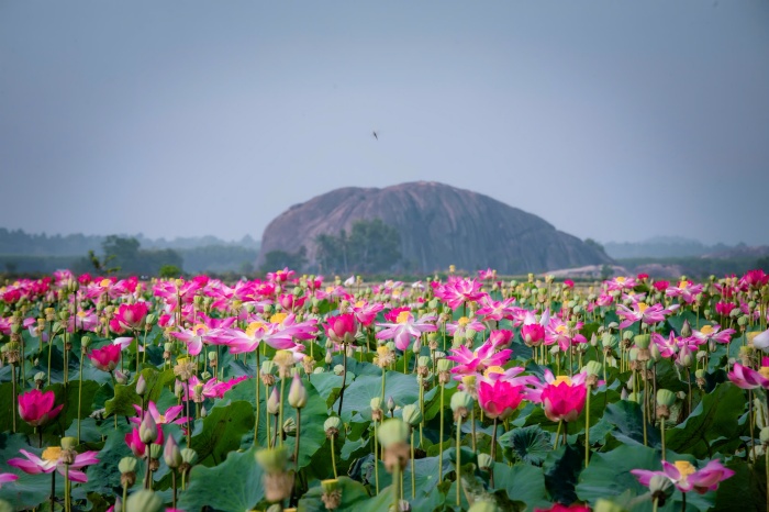 Không ồn ào, không đông đúc, cánh đồng sen nơi đây hiện lên như một bức tranh mùa hè dịu dàng. Hàng nghìn bông sen hồng đua nhau nở rộ, trải dài ngút tầm mắt, xen lẫn là màu xanh mướt của lá, tạo nên một không gian vừa thơ mộng vừa thuần khiết. Đặc biệt, khi nhìn từ trên cao, cả cánh đồng như một tấm thảm khổng lồ, nơi sắc hồng và sắc xanh hòa quyện, khiến cảnh sắc trở nên sống động và đầy sức hút.