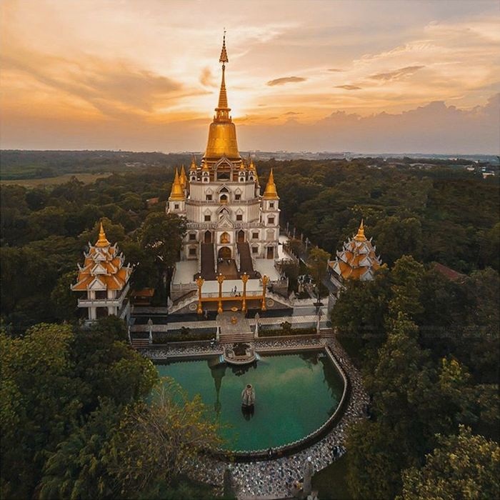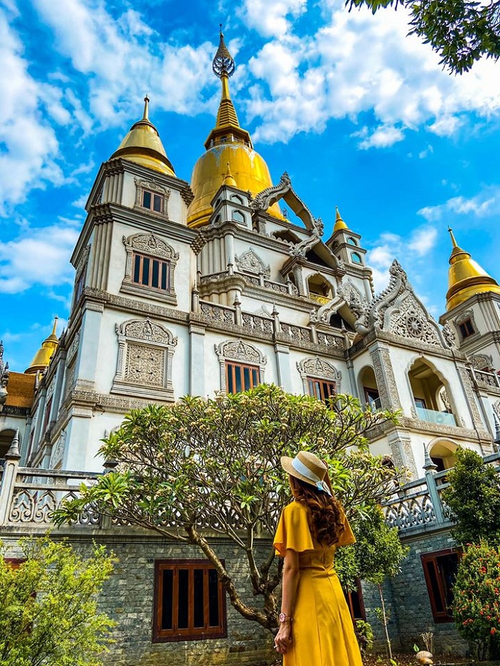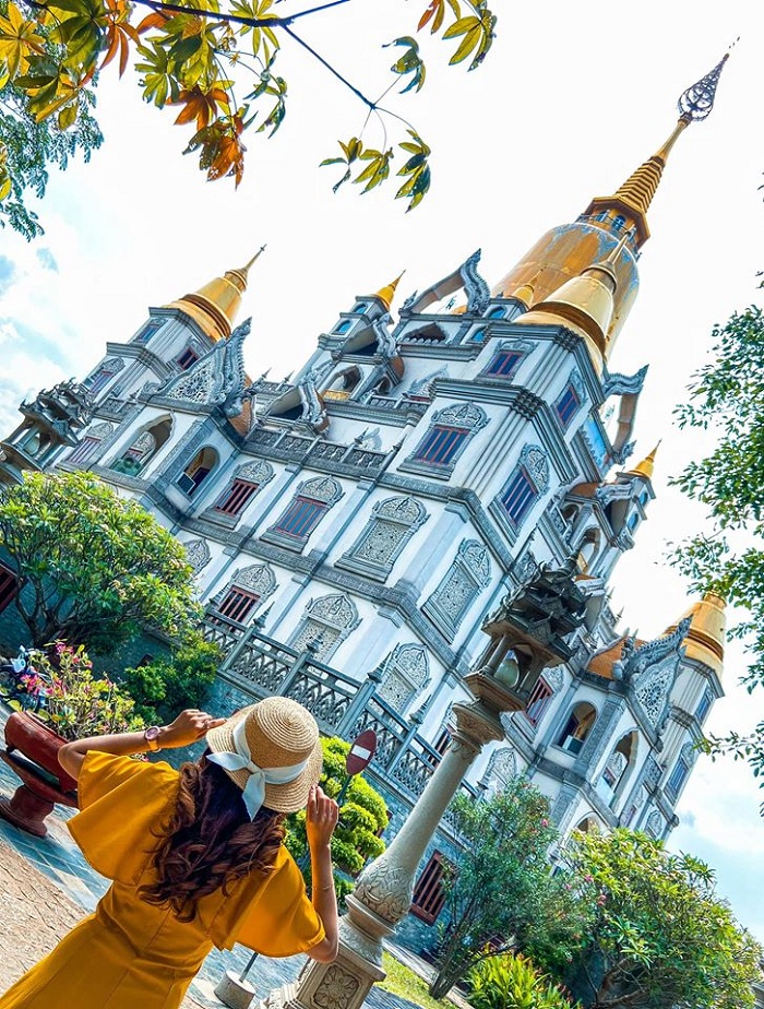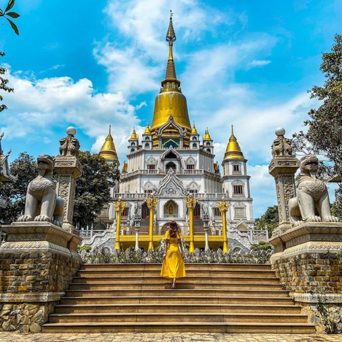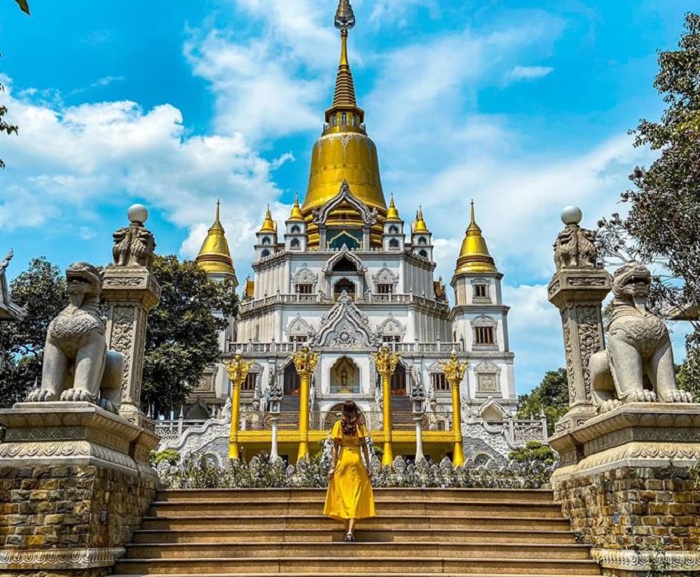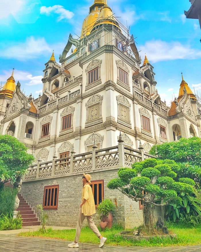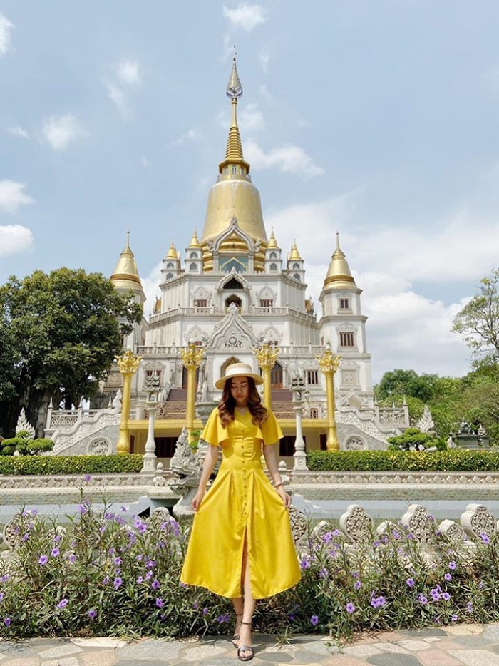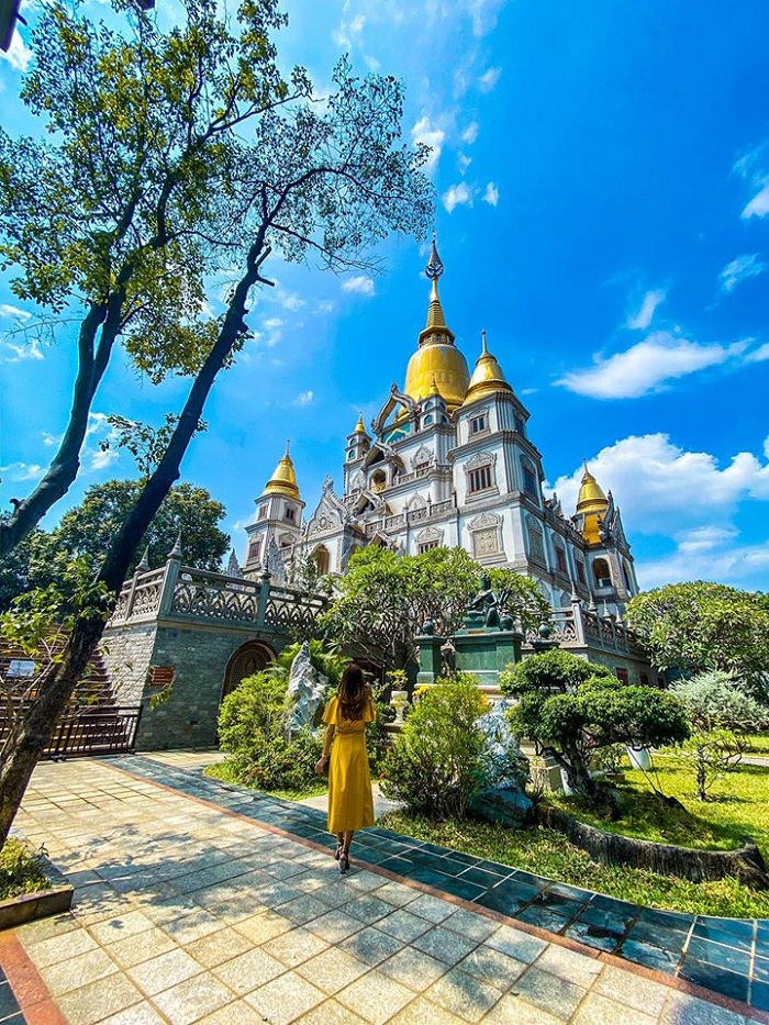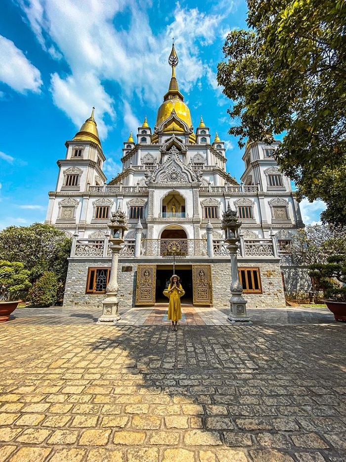 Chùa có kiến trúc độc đáo. Ảnh: Thủy TiênGotama Cetiya là bảo tháp chính có quy mô lớn nhất Việt Nam, cao 56 m và 4 tháp xung quanh, có tổng sức chứa trên 2.000 người. Nơi này lấy màu trắng làm chủ đạo, kết hợp cùng gam vàng rực rỡ ở phần chóp mang hơi hướm Thái Lan. Đây cũng là background sống ảo được nhiều bạn trẻ lựa chọn khi có cơ hội ghé chùa.