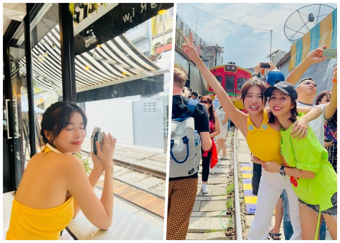 Cao Thái Hà rất thích thú khi ghé thăm khu chợ đường ray Maeklong nên đã cùng bạn bè thoải mái check-in, pose dáng xả láng sau đó vào một quán cafe ngồi ngắm cảnh và tận hưởng không khí náo nhiệt tại đây.