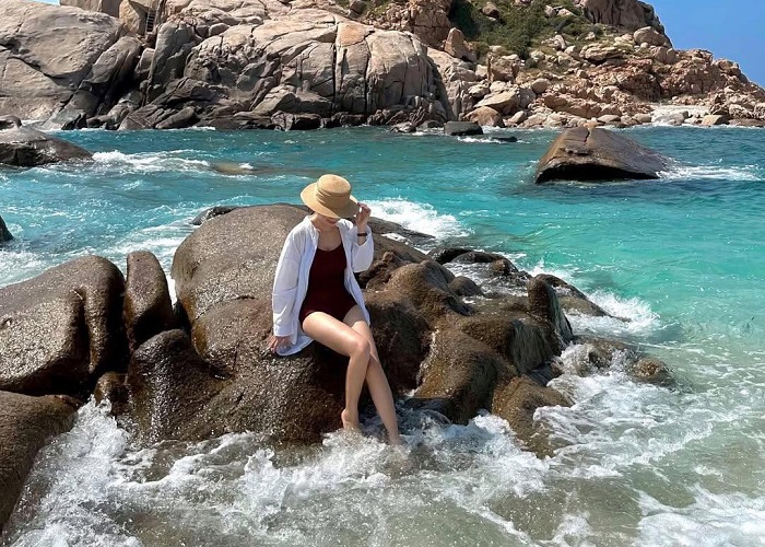 Vịnh Vĩnh Hy có rất nhiều góc lên ảnh đẹp, là điểm du lịch mùa hè ở Việt Nam. Ảnh: Phụng NguyênĐiểm đến đầu tiên khi chạm chân Vĩnh Hy chính là làng chài Vĩnh Hy với đủ loại dịch vụ. Ở đây có homestay đẹp, view biển, nhà hàng hải sản tươi ngon, cửa hàng lưu niệm… Buổi sáng, tại điểm du lịch mùa hè ở Việt Nam này, bạn có thể đi dạo dọc bờ kè quanh làng, đón bình minh và không khí trong lành.