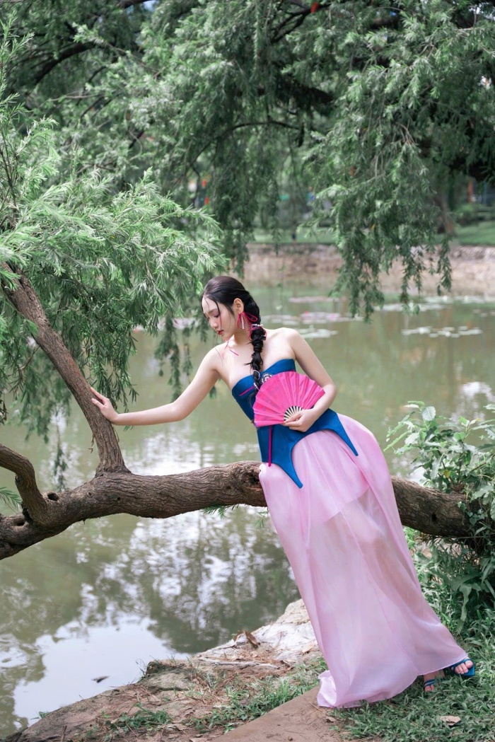 Thay vì dáng áo dài truyền thống, Minh Anh chọn thiết kế cúp ngực hiện đại, giúp khoe khéo bờ vai trần và xương quai xanh thanh mảnh. Điểm nhấn là phần vạt áo được cắt xẻ nhọn hoắt, mô phỏng theo dáng áo yếm hoặc áo chẽn cổ xưa nhưng được làm mới đầy cá tính.