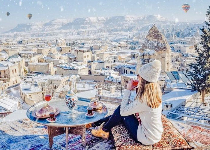 Cappadocia như hóa thành xứ sở thần tiên khí tuyết trắng rơi với những cấu trúc đá hình ống khói cổ tích. Ảnh: TwitterNhững giấc mơ cổ tích của bạn sẽ trở thành hiện thực tại Cappadocia - điểm đến Thổ Nhĩ Kỳ nổi tiếng với cảnh quan địa lý đa dạng và kiến trúc truyền thống. Cappadocia trông giống như một xứ sở thần kỳ vào mùa đông, thị trấn phủ đầy tuyết trắng với những cấu trúc đá hình ống khói cổ tích khi nhiệt độ xuống thấp tới -10 độ C vào mùa Giáng sinh.
