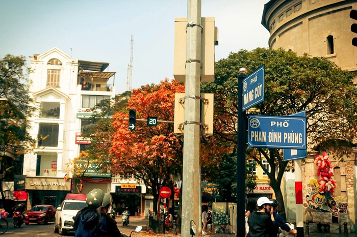 Những tán lá đỏ vàng nổi bật giữa không gian phố cổ tạo nên cảm giác như Hà Nội đang khoác lên mình một “màu áo mới”. Ảnh: Thu ThảoBốt Hàng Đậu từ lâu đã là địa điểm quen thuộc của nhiều nhiếp ảnh gia mỗi mùa cây thay lá. Chính vì vậy, điều khiến Thu Thảo trăn trở nhất là làm sao tránh sự trùng lặp.