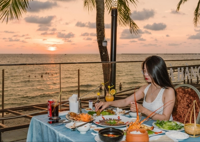 Dịp Tết, khi thời tiết Phú Quốc vào độ đẹp nhất (biển êm, trời trong), trải nghiệm vừa thưởng thức bữa tối, vừa nghe tiếng sóng vỗ ì oạp dưới chân và ngắm mặt trời đỏ rực từ từ lặn xuống đường chân trời sẽ là kỷ niệm khó quên nhất chuyến đi.