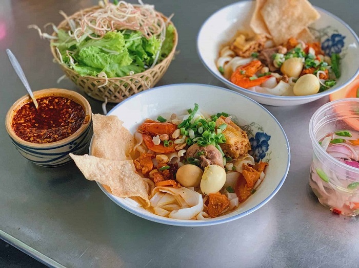 Mì Quảng ở đây đặc trưng, ăn một lần là nhớ mãi. Ảnh: Kanehoshi VuMì Quảng của quán Huệ được chan nước lèo sâm sấp, vừa đủ để sợi mì dậy mùi thơm, mềm mại hơn nhưng vẫn đậm đà, mà không bị nát. Bạn có thể gọi mì bò với những miếng bò tươi thái khéo léo vừa miệng hoặc mì Quảng gà ăn giòn dai… Quán đông nên bạn sẽ phải chờ hơi lâu nhưng nhân viên đon đả, nhiệt tình. Giá một suất ở đây 30.000 – 50.000 đồng tại quán mì Quảng ngon ở Đà Nẵng.